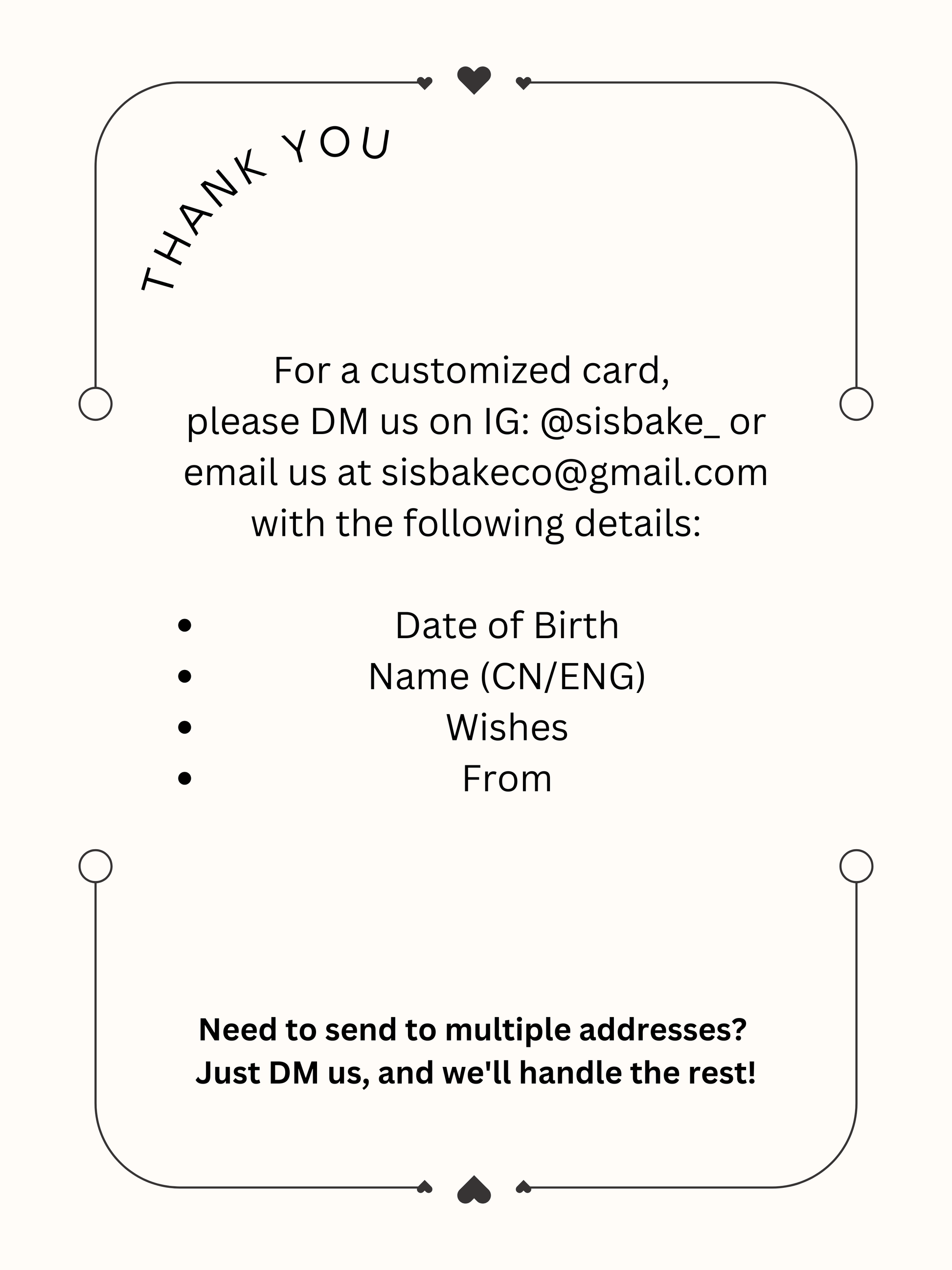 For a customized card, please DM us on IG: @sisbake_ or email us at sisbakeco@gmail.com with the following details: