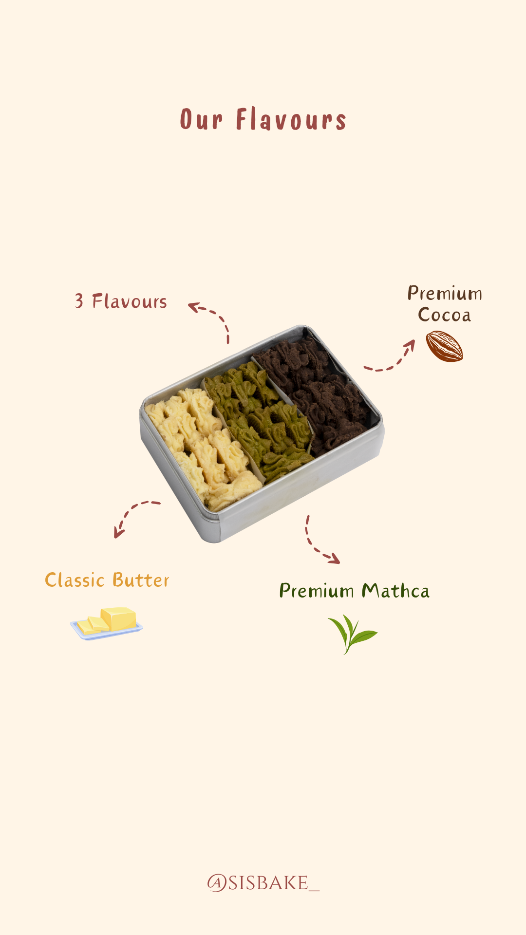 Enjoy the Sisbake's Classic-Cocoa Butter Cookies and Trio Flavours Butter Cookies. A harmonious blend of luxurious butter, classic cookie taste, and rich cocoa for a doubly delightful indulgence.